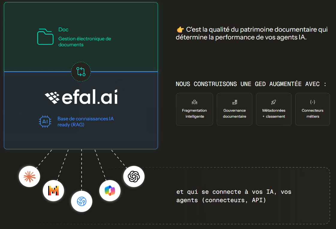 Avec Efalia, votre GED devient la mémoire vivante de votre organisation, interrogeable en langage naturel par vos équipes et vos systèmes automatisés. Vous ne cherchez plus vos documents. Vous leur posez des questions. Ils vous répondent.